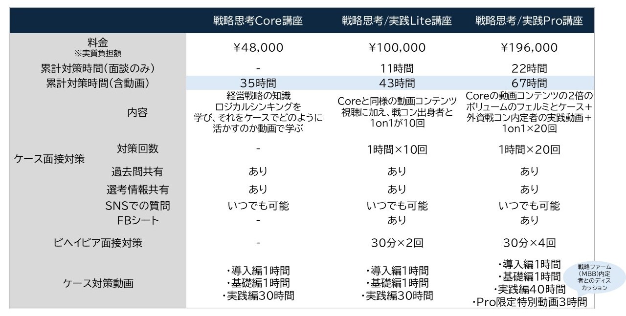 ケース面接で問われる課題解決スキルを、動画で学び、ケーススタディで実践する事で着実に身に付けられます。”戦略コンサルティングファームの面接に合格する”事を重視した設計です。